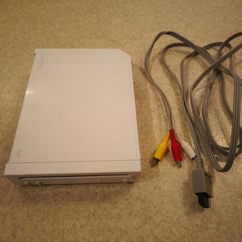 Nintendo Wii pelikonsoli. Mukana johdot, rattiohjain ja liikesensori