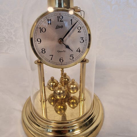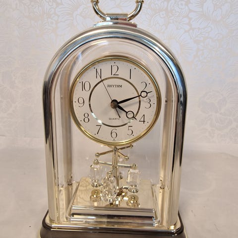 Pöytäkello heilurilla. Toimii. Etuosassa kilpi, jossa kaiverrus 31.5.1986 (korkeus 16 cm)