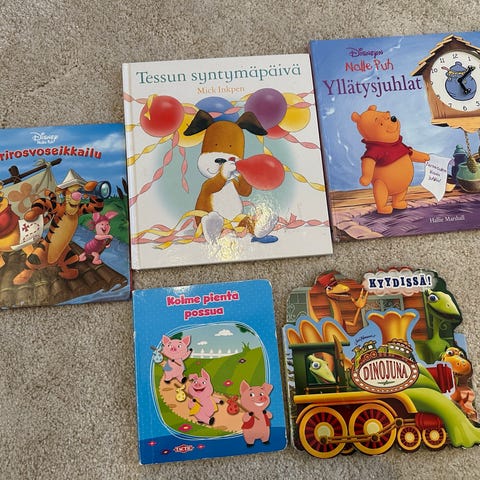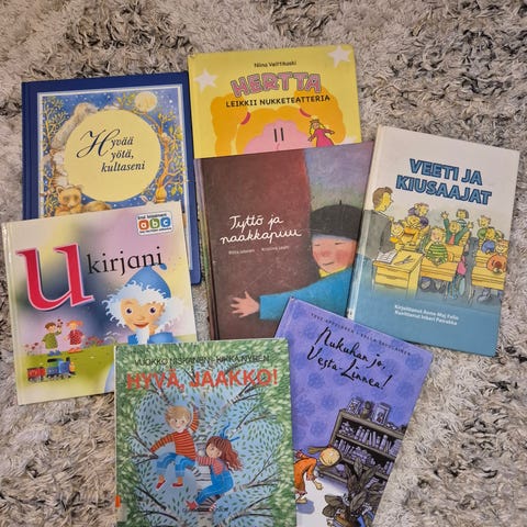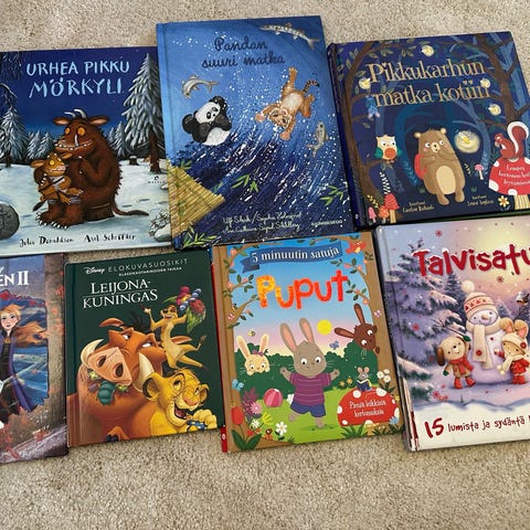 Kirjapaketti, joka sisältää useita lasten kuvakirjoja ja yhden tietokirjan. Mukana on muun muassa kuvakirjoja pienille lapsille sekä tarinakirjoja isommille lapsille. Kirjoissa on värikuvituksia ja ne soveltuvat yhteiseen lukuhetkeen tai itsenäiseen lukemiseen lukutaidosta riippuen. Paketti sopii perheelle, jossa on eri-ikäisiä lapsia, tai esimerkiksi päiväkotiin tai muuhun lasten ryhmään. 1€/kpl Kunto vaihteleva. Lähetys onnistuu jos ostaa useamman.