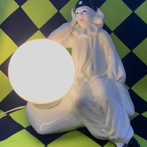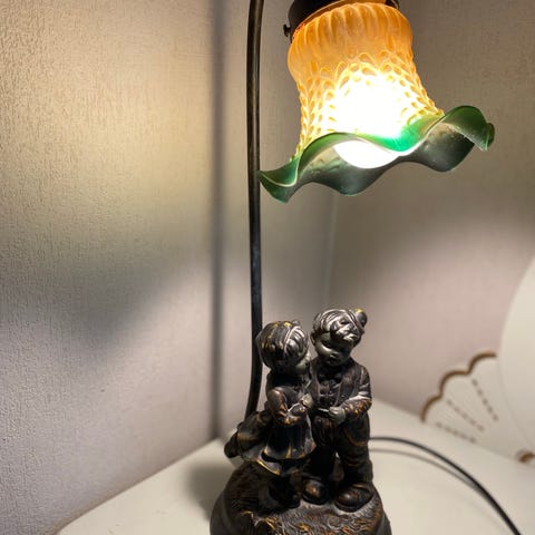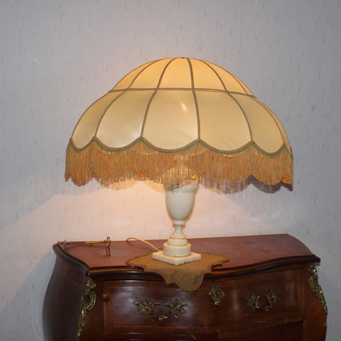 Pöytävalaisin Art Deco -tyylinen posliinijalka ja kulmikas luonnonvalkoinen varjostin. Mitat: korkeus 39 cm, varjostimen leveys alhaareunassa 25 cm ja yläreunassa 12 cm. Nouto kotoa. Käteismaksu.