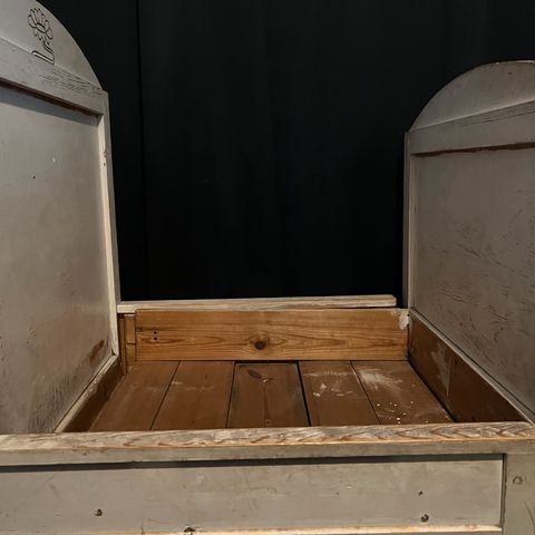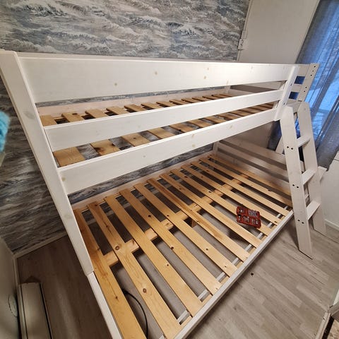 Kuvien alempi sänky vaatii kunnostusta ja tulee kaupanpäälle. Sängynpäädyn liitos vaatii uuden liimauksen. Sänky vanhaa tuotantoa, mutta ostovuosi ei ole tiedossa. Edellinen omistaja maalannut sängyn ja vaihtanut pohjan Ikean sälepohjaan.