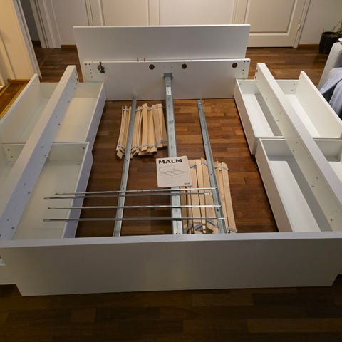 🍽️ Hyväkuntoinen IKEA MALM Sängynrunko, jossa 2 laatik & WELLPUR GOLD F110 Vaahtomuovipatja ovat myytävänä.
