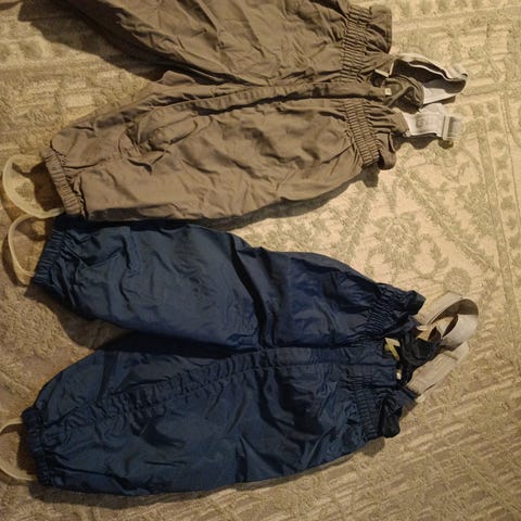 Lasten henkselihousut, koko 80. Paketissa useammat housut, väreinä ruskea, harmaanruskea ja vaaleanharmaa. Housuissa joustavat henkselit, säädettävä vyötärö ja lahkeissa kuminauhat sekä jalkalenkit. Sopivat käytettäväksi esimerkiksi ulkoilu- tai välikausihousuina lapselle, jonka vaatekoko on noin 80 cm.