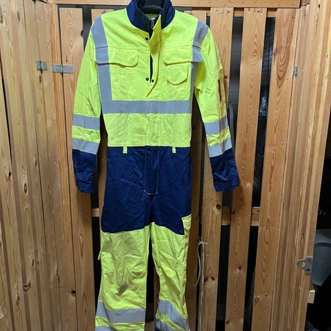 Haalari koossa 50. Väritys on keltainen-sininen huomioväri, jossa heijastinnauhat käsivarsissa, jaloissa ja vartalon ympärillä. Haalarissa on useita taskuja, muun muassa rintataskut ja sivutaskut, sekä läpät ja vetoketju edessä. Hihassa on merkintä, joka viittaa suojaominaisuuksiin, kuten liekinkestävyys ja suojaus sähkö- ja lämpöriskejä vastaan. Soveltuu työ- ja suojavaatteeksi vaativiin olosuhteisiin, joissa tarvitaan näkyvyyttä ja suojaa.