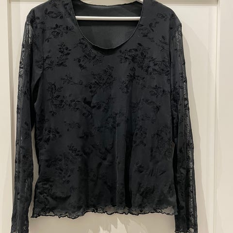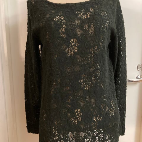 Hyvässä kunnossa oleva kiva pitsipaita. Kokonaan läpinäkyvä, hihoissa säädettävät rypytysnauhat.