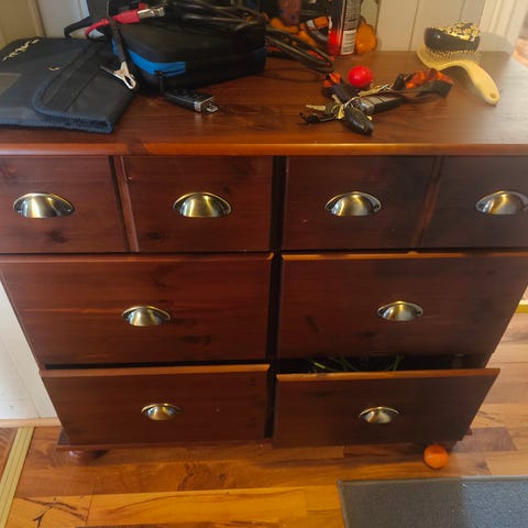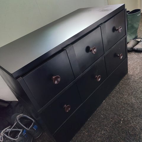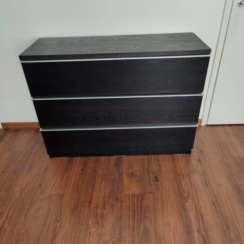 Musta lipasto, jossa on viisi vetolaatikkoa. Kapea ja korkea malli sopii esimerkiksi makuuhuoneeseen, eteiseen tai olohuoneeseen vaatteiden, liinavaatteiden tai pientavaroiden säilytykseen. Runko ja etusarjat ovat tummasävyistä materiaalia, pinta on sileä ja yhtenäinen ilman vetimiä. Soveltuu sijoitettavaksi seinää vasten sisätiloissa. Yksi laatikko temppuilee.