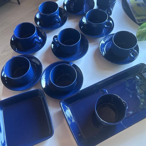 Isompien lautasten halkaisija n. 14 cm ja pienempien n. 12 cm. Kupit ovat halkaisijaltaan n. 7 cm ja kulho n. 18,5 cm. Väri on tyylikäs vihreä, kunto hyvä.