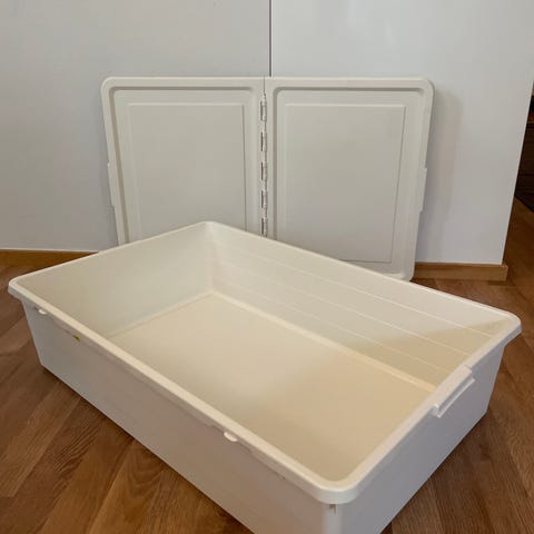 Sängynalyslaatikko esim. lastenhuoneeseen legojen tai muille tärkeiden lelujen säilytykseen. Ikean Nöje. Koko 58x58, korkeus 15cm. Saa näppärästi myös kasaan ja voi säilyttää pienessäkin tilassa