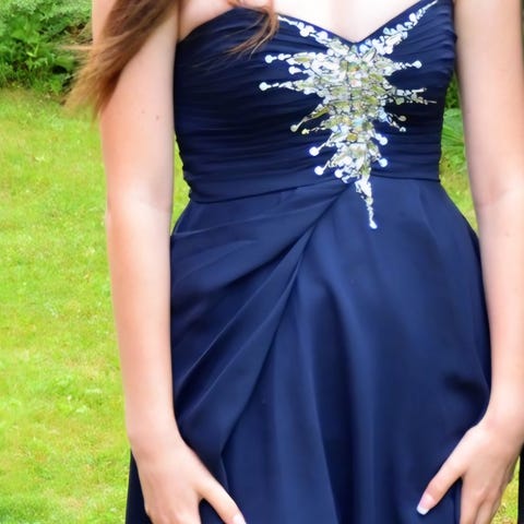 Kaksi kertaa käytetty mekko (Zazabella). Malli Dazzling. Koko 34 (vastaa kokoa 38). Pitsinen yläosa, sifonkinen alaosa.