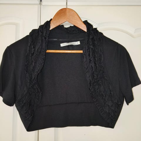 Seppälä bolero, naisten koko L. Väriltään valkoinen ja materiaaliltaan viskoosia 95% ja elastaania 5%. Lyhyt, avonainen malli, jossa lyhyet hihat. Edessä röyhelöreunus, joka jatkuu kauluksen ympäri. Sopii esimerkiksi mekkojen tai toppien kanssa käytettäväksi kevyenä päällitakkina tai asun viimeistelijänä. Käytetty vain kerran juhlissa, eli kunnoltaan melkein kuin uusi!