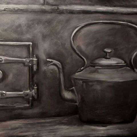Kahvipannu, kynttilä ja suopursuja puuastiassa, mitat kehyksineen leveys 49 cm ja korkeus 62 cm. Tekijä O Keinonen 1989.