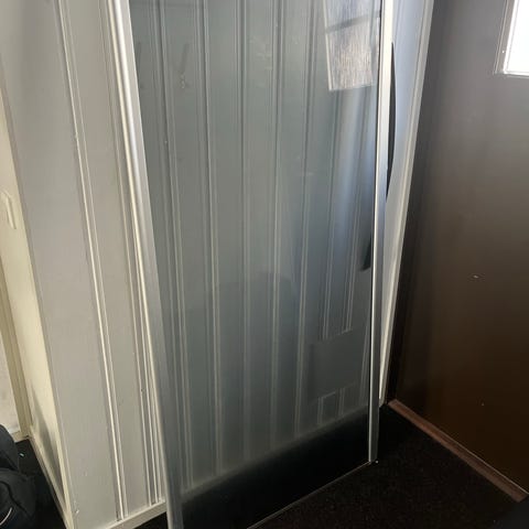 Oven mukana tulevat alumiiniset seinäkiskot, sekä ruuvit oven kiinnittämiseksi seinäkiskoon.