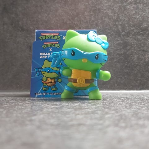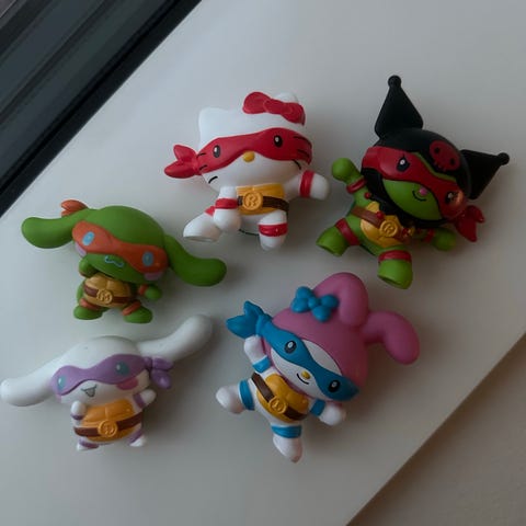 Myydään kuvan McDonalds Teenage Mutant Ninja Turtles -hahmot. Nämä kohtaavat Sanrion Hello Kitty -maailman. Ovat ehjät ja siistit.
