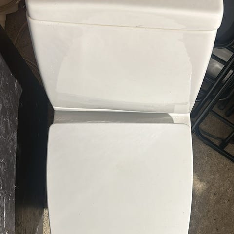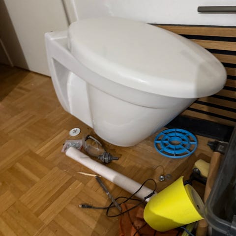 Valkoinen WC-istuin, lattiamallinen malli. Korkea, yhtenäinen säiliö ja istuinosa. Takaa lattiaan asennettava, viemäriliitäntä lattiaan. Mukana huuhtelusäiliö ja kansi, kuvissa näkyvät tiivisteet ja kiinnitystarvikkeet. Soveltuu asennettavaksi kylpyhuoneeseen tai WC-tilaan, jossa viemäröinti on lattiassa.