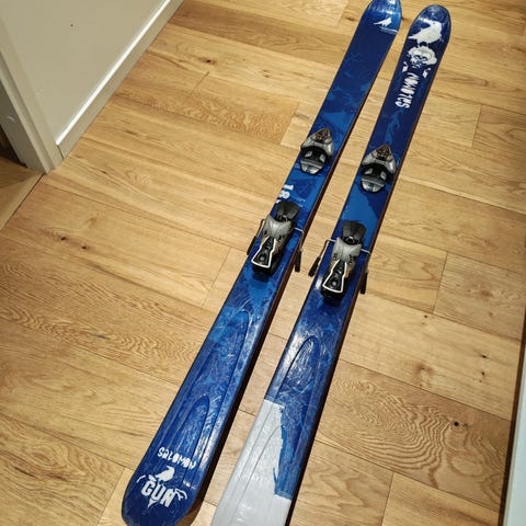 Laskettelumonoihin kiinnitettävät lyhyet sukset.