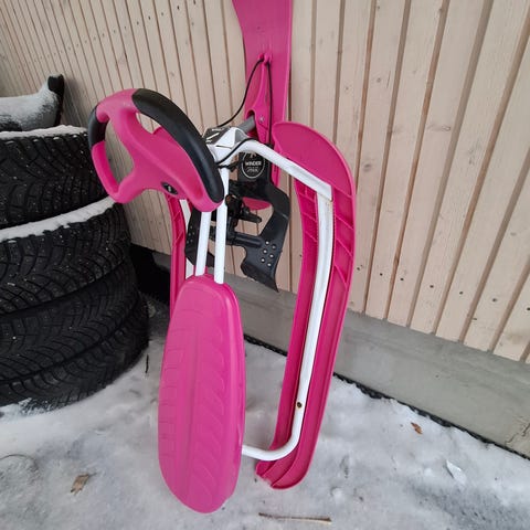 Stiga rattikelkka lapsille. Kelkassa on ohjauspyörä ja kolme suksimaista jalasta, jotka ovat mustat. Rungon värit ovat keltainen ja punainen. Soveltuu talvileikkeihin ja mäenlaskuun lumella. Materiaalina on kovamuovi ja metallirunko, jotka on suunniteltu kestämään ulkokäyttöä lumisissa olosuhteissa.