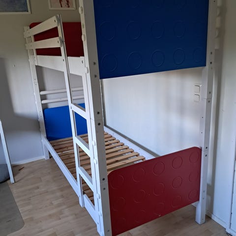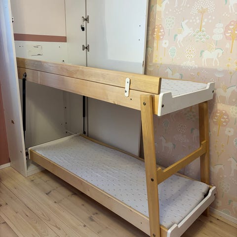 Lasten Bunkka -kerrossänky. Sänky taittuu pystyasentoon kaapin sisään, mikä säästää tilaa huoneessa. Rakenteessa on kaksi päällekkäistä nukkumapaikkaa sekä tikkaat helpottamassa yläpedille nousua. Vasenkätinen ovi. Kaapin ulkomitat suljettuna: (LxSxK) 64,6x34x163 cm. Tilantarve avattuna: 64,6x165,7x163 cm. Vuoteen mekanismi on massiivikoivua ja vaneria, kaappi on laminaattipinnoitettua kalustelevyä. Mainio varavuode pikkuväelle mummolaan tai mökille.