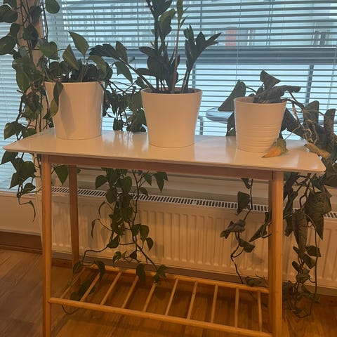 Kevyt ja siro sivupöytä/apupöytä/kukkapöytä, taitaa olla Jyskin mallistoa. Hyväkuntoinen, vain joitain pieniä kulumajälkiä kannen reunassa (katso kuvasta).