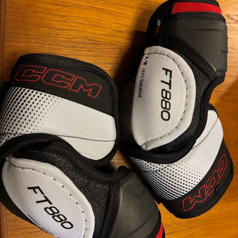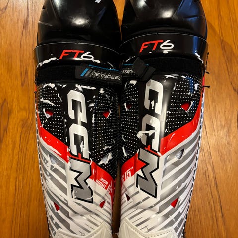 CCM Jetspeed FT6 jääkiekkokyynärsuojat. Koko SR L. Kunto hyvä. Olleet harrastekiekko käytössä vuoden. Juuri pestyt. Suojissa on moniosainen rakenne, kovamuoviset kuoret kyynärpään alueella ja pehmustetut sivuosat. Tarrakiinnitykset auttavat säätämään istuvuuden. Soveltuu jääkiekkoon ja muuhun jäällä pelattavaan mailapeliin, jossa tarvitaan kyynärpäiden suojaa.
