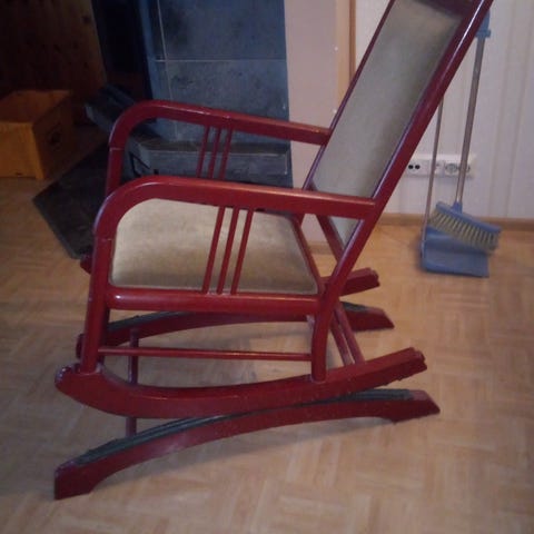Puinen ruskea keinutuoli, jossa käsinojat ja korkea selkänoja pystypinnoilla. Istuimessa irrallinen, nauhoilla kiinnitettävä pehmustetyyny. Sopii sisäkäyttöön istuma- ja lepohetkiin esimerkiksi olohuoneessa tai mökillä.