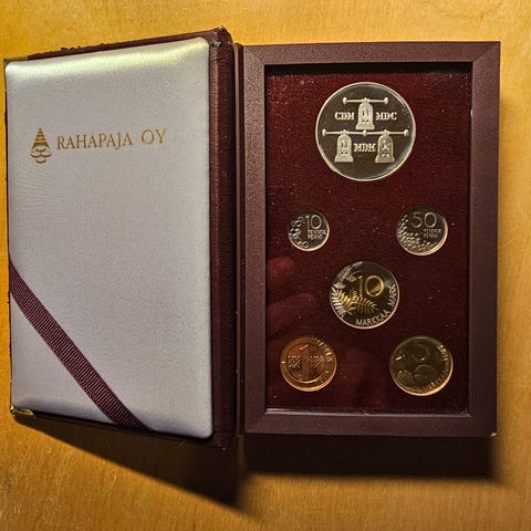 Proof-laatuinen Suomen markka rahasarja, jossa vuoden 1999, 2000 ja 2001 rahat kapseleissa proof-laatuisina + hopeajetoni. Numeroitu setti. Sisältää alkuperäistodistuksen. Painos vain 15 000. Erittäin hienossa puulaatikossa.