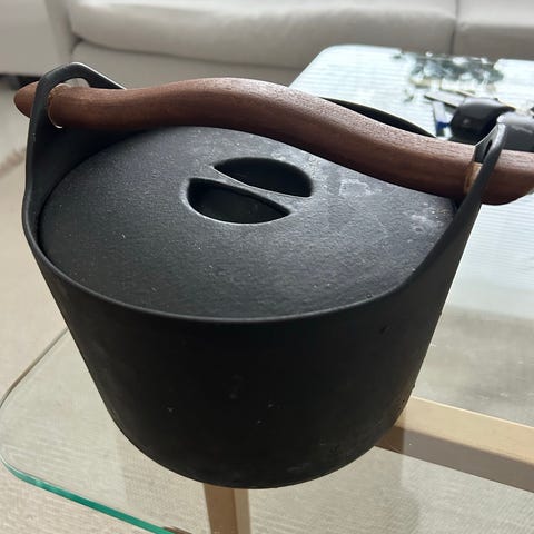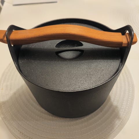 Uusi, lahjaksi saatu Timo Sarpaneva 3l emaloitu valurautapata sekä puukahva.