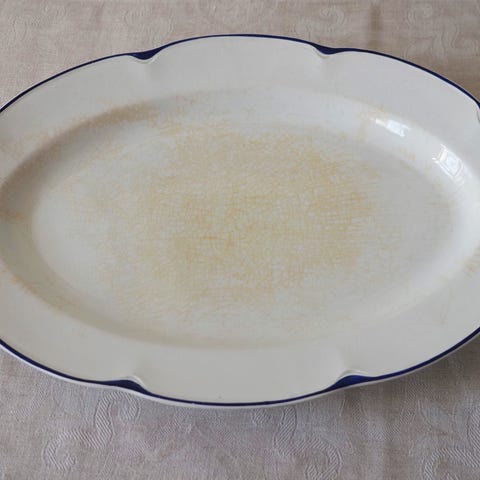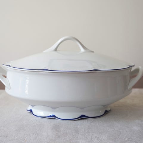"Pieni" soppakulho/perunakulho, pituus 30 ja leveys 20 cm. Kulhon sisällä pientä krakeloitumista ja jonkin verran värjäytymiä, pohjassa myös krakeloitumista ja kulumisjälkiä, kansi on OK. Piippuleima.