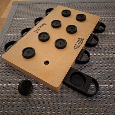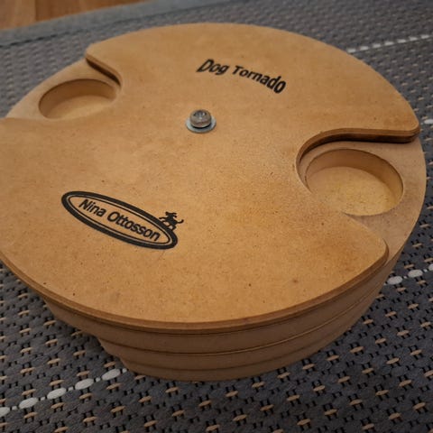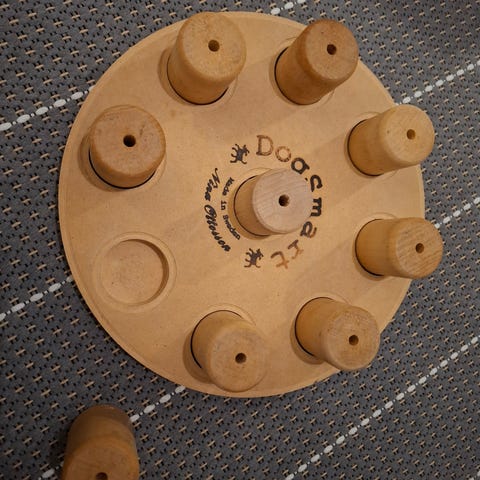 Vanerista tehty koiran peli. Kantta pyörittämällä saa alla olevan levyn koloista nameja. Saattaisi soveltua myös kissalle, koska ei sisällä isoja palikoita.
