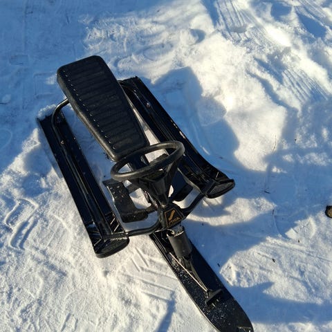 Stiga rattikelkka lapsille. Sininen muovirunkoinen kelkka, jossa ohjausratilla käännettävä etusuksi ja kaksi rinnakkaista takasukua. Jalkatuet sijaitsevat molemmilla puolilla ja kelkan runko on suunniteltu tukemaan istuma-asentoa. Sopii lumella laskemiseen mäissä ja piha-alueilla. Kelkan kyljessä on Stiga-merkinnät.