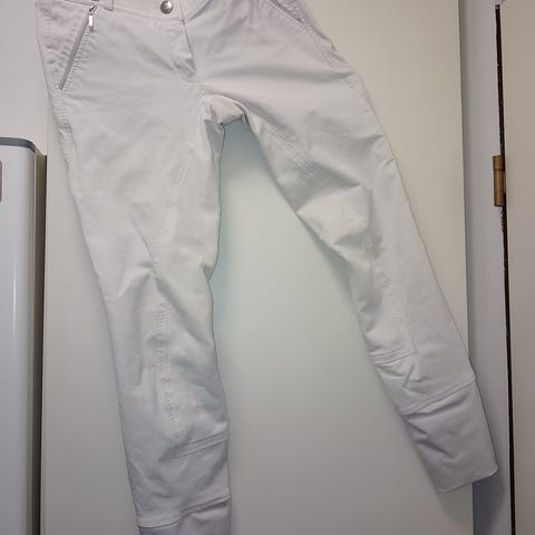 Myynnissä siistit ja täysin ehjät, elegantit merkki- kisaratsastushousut kokoa 146. Pientä kulumaa ja tahroja on kisakäytössä tullut ,mutta ei mitään isompaa virhettä. Nämä tyylikkäät ja laadukkaat Pfiff ratsastushousut on väriltään valkoiset ja housuissa on vaaleanharmaat mokkajäljitelmäkokopaikat Housuissa on etupuolella pieni vetoketjutasku. Lahkeiden suulla on perinteinen tarrasäätö.