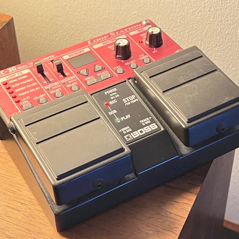 Boss RC-30 Loop Station kitarapedaali. Kaksipolkiminen looperi, jossa on useita jalkakytkimiä ja säätimiä toistojen, tasojen ja efektien hallintaan. Laitteessa on useita liitäntöjä, kuten instrumentti- ja XLR-sisääntulot sekä stereolähdöt. Soveltuu sähkökitaralle, bassolle ja muille instrumenteille toistojen tallentamiseen ja kerrostamiseen live-soitossa ja harjoittelussa.