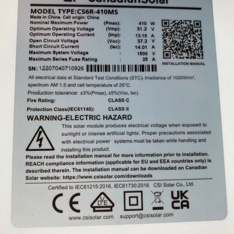 Paneelin hyötysuhde: noin 18,52–20,9 %