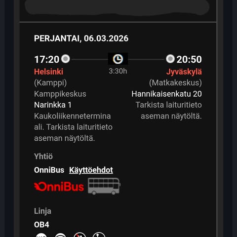OnniBus bussilippu reitille Jyväskylä (Matkakeskus, Hannikaisenkatu 20) – Helsinki (Kamppi, Narinkka 1). Lähtö JKL klo 17.15 sunnuntaina 22.2. Sisältää isomman jalkatilan paikan