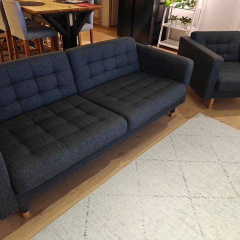 Myynnissä Ikean Landskrona nojatuolit. Landskrona on kutsuva ja lämmin. Sen muotokieli on samaan aikaan hyvin retrotyylinen, että nykyaikainen. Nojatuolien rungot ovat ehjät. Tyynyt ryhdissään. Väri: Gunnared tummanharmaa. Nojatuolit eivät ole olleet päivittäisessä käytössä vaan stailaus rekvisiittana. Huomiotavaa tuolien kunnossa: Samassa tilassa on oleskellut koira. Puhdistuksesta huolimatta hieman koirankarvoja tuoleista löytyy. Ei lemmikin hajua, eikä tuhoja. Muuten tuolit ovat erinomaiskuntoiset. Ryhmän pakettihinta: 369e tai 199e/kpl.