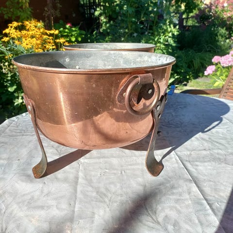 Kymmenen kuvanmukaista kupariastiaa, pannua, kattila, ruukkua, kysy lisää, jos kiinnostunut