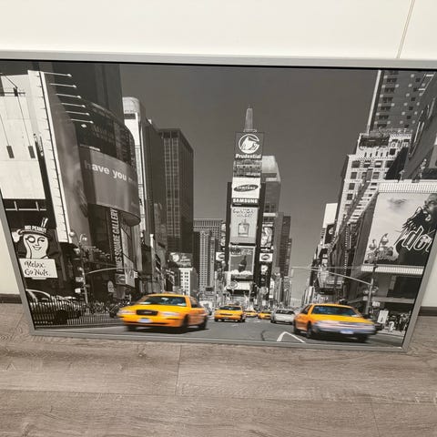 IKEA NEW YORK sisustustaulu, jossa on yöaikainen kaupunkimaisema ylhäältä kuvattuna. Sopii seinäkoristeeksi esimerkiksi olohuoneeseen, makuuhuoneeseen tai työtilaan. Kuvassa näkyy valaistuja pilvenpiirtäjiä ja katuverkostoa, jotka tuovat kaupunkitunnelmaa sisustukseen.