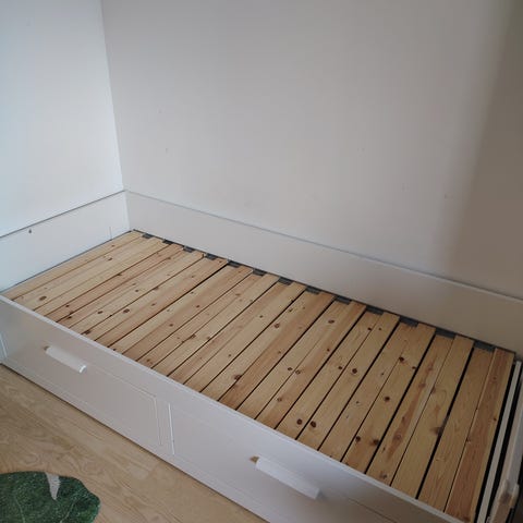 Myyn siistin ja hyväkuntoisen BRIMNES-sängyn, mukaan tulee patja. Patja on puhdas, eikä siinä ole tahroja tai reikiä. Patja on ostettu noin 8 kuukautta sitten ja se on napakka (kova).