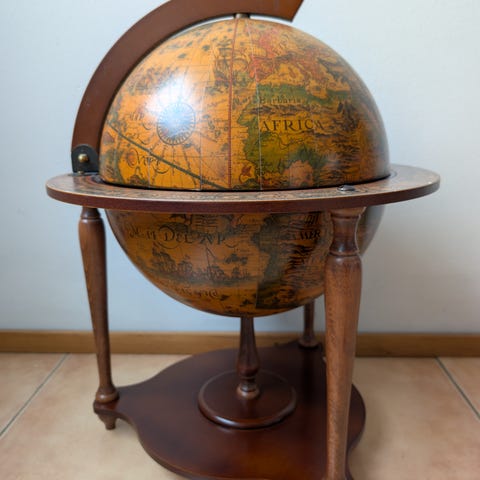 Maapallo baarikaappi, jossa avattava maapallo ja sisäosa pullojen ja lasien säilytykseen. Vaalea maapallo on kiinnitetty tummanruskeaan puujalustaan, jossa on useita sorvattuja jalkoja ja pyöreä alataso. Yläreunassa on merkittynä asteikko ja koristekuvioita. Sopii esimerkiksi olohuoneeseen tai työhuoneeseen säilytys- ja sisustuselementiksi.