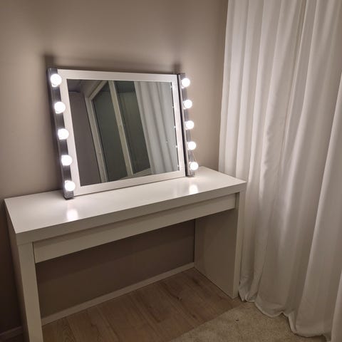 Myydään muuton alta pois. Peili 65x65 ja meikkivalot. Meikkivalot on kiinnitetty peiliin kaksipuolisella teipillä, joten ne saa halutessaan irti. Peili ja valot moitteettomassa kunnossa. Varapolttimot saa mukaan. Nouto nihtisillasta.
