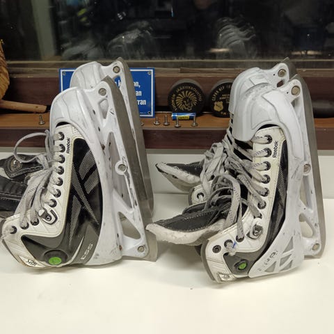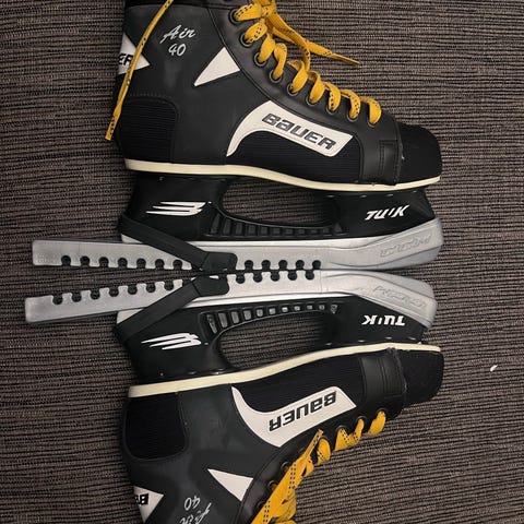 Flyers jääkiekkoluistimet, koko 40. Mustat luistimet, joissa valkoinen teräkotelo ja nauhakiinnitys. Sisäosa on pehmustettu ja varren sisäpinta on vaaleaa materiaalia. Soveltuvat jääkiekkokäyttöön tai yleiseen luisteluun jäähalleissa ja ulkokentillä. Koko merkitty kengän sisäpuolelle numerolla 40.