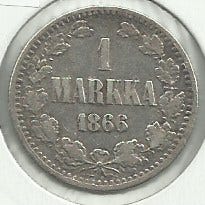 Suomen 1 markan hopearaha vuodelta 1865. Kolikon toisella puolella teksti "1 MARKKA 1865" ja tammenlehvistä muodostuva seppele, toisella puolella Venäjän keisarikunnan vaakuna sekä reunatekstit, joissa maininta hopeapitoisuudesta ja kappalemäärästä. Sopii esimerkiksi kokoelmakäyttöön tai numismatiikan harrastajalle historiallisena rahakohteena. hinta 12 e posti 2.50 e