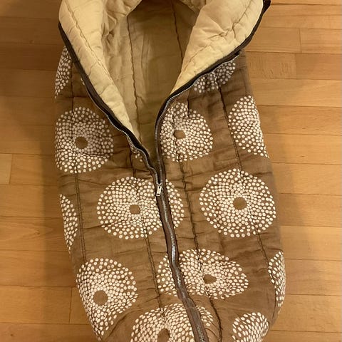 Äitiyspakkauksen makuupussi 70-luvulta, oikea vuosi lienee 1973-1974.