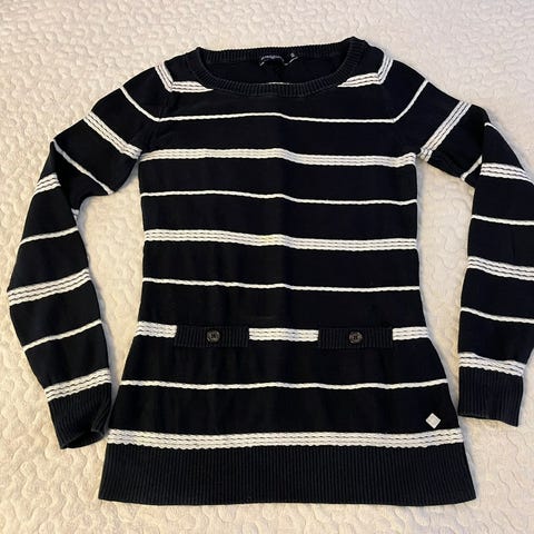 Henri-Lloyd naisten neulepaita, koko XS. Materiaalina 100% puuvilla. Neuleessa on valkoinen pohjaväri ja hennon vaaleanpunaiset raidat. Pyöreä pääntie ja resorit helmassa sekä hihansuissa. Hihassa on Henri-Lloyd merkki.