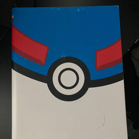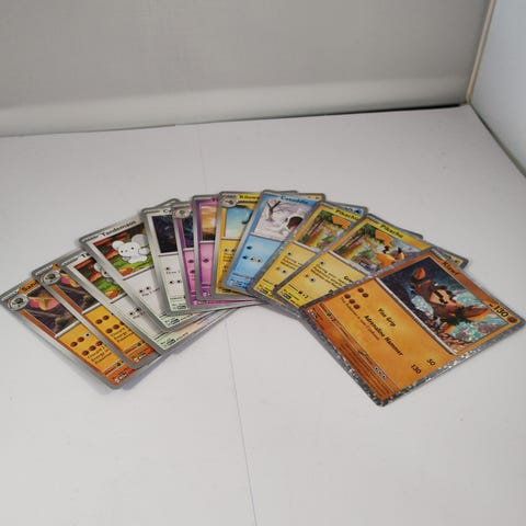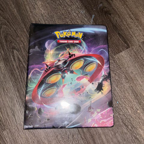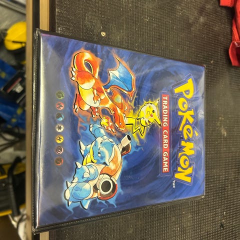 Pokémon keräilykortit kansiossa. Kansiosta löytyy sekä Pokémon TCG -pelikortteja (mm. erilaisia Pokémon-, kouluttaja- ja energiakortteja) että animaatiosarjaan perustuvia kuvituskortteja. Kortit on säilytetty muovitaskuissa kansiossa. Soveltuu Pokémon-korttien keräilyyn ja säilytykseen.