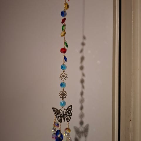 Värikäs aurinkosieppari ikkunaan roikkumaan aurinkoiselle puolelle ja aurinko heijastaa pieniä valopilkkuja seiniin ja kattoon kristalleista