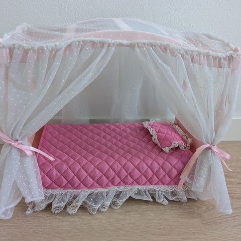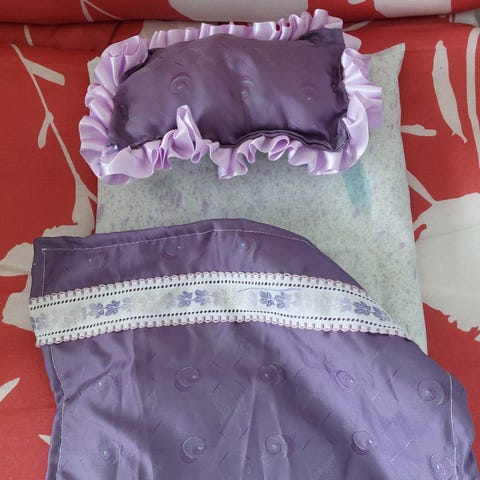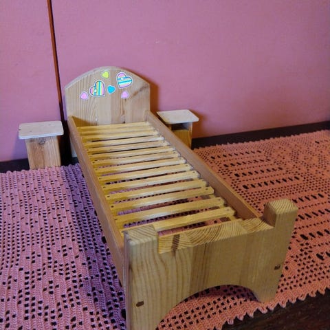 Tehty juuri. Patja noin 4cm. Reunapitsi muovi, peitto ja tyyny. Ommeltu käsin. Mahtuu reilusti 2 nukkea n. 30 cm pituus.