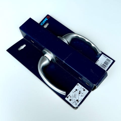 Myydään uusi käyttämättömäksi jäänyt alumiini hopea Hoppe Bonn ulko-oven kahva.