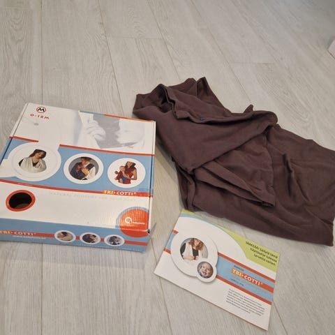 Tästä erittäin näppärä kantoliina. Ei tarvitse sitoa, sen voi vaan pukea päälle. Laitetaan ristiin olkapäille ja lapsi sujautetaan väliin. Ollut paljon käytössä taaperoaikana. Tuli käytettyä enemmän kuin sidottava kantoliinaa.