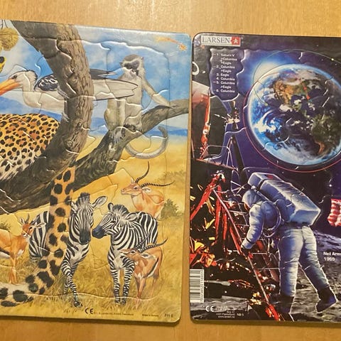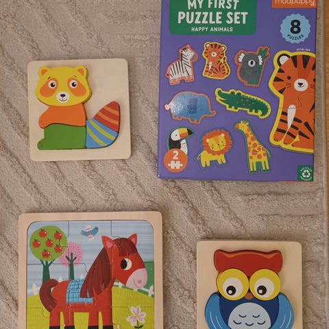 Ensipalapeli, seitsemän eläinaiheista palaa. Pelilaudan koko noin 21 x 29 cm. Hyvä kunto.