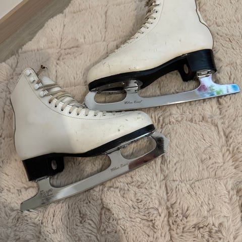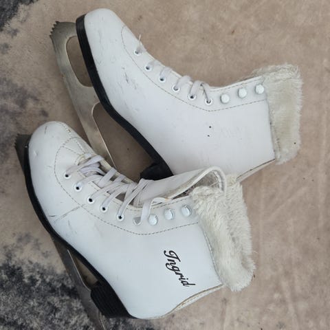 Graf Prestige -taitoluistimet, koko 36. Valkoiset nahkapintaiset luistimet, joissa on korkea varsi ja nauhakiinnitys. Sisäpuolella pehmustettu vuori. Terät soveltuvat muuhun luisteluun, kuten perusluisteluun ja taitoluistelun alkeisiin. Koko merkitty kengän sisäpuolelle (36).
